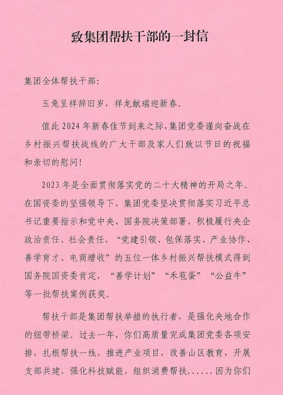 值此2024年新春佳节到来之际,集团党委谨向奋战在乡村振兴帮扶战线的广大干部及家人们致以节日的祝福和亲切的慰问!