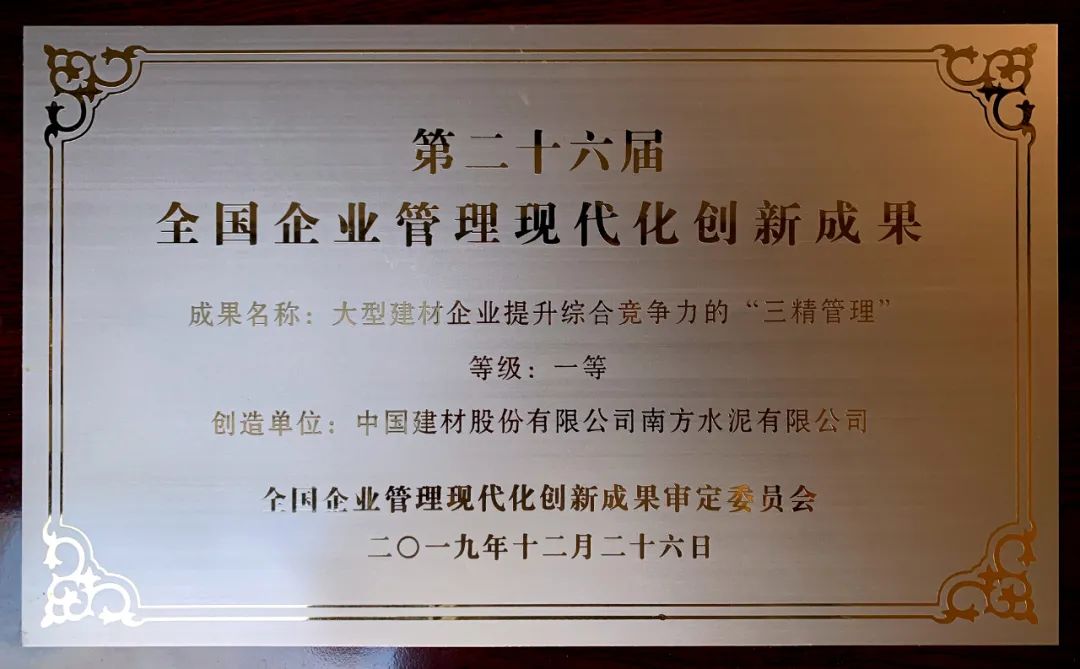 来源:集团公司管理部、南方水泥 发布时间:2020-10-2910月22日,由中国企业联合会主办的2020年全国企业管理创新大会在河南焦作召开。大会发布了第二十六届全国企业管理现代化创新成果,彩票论坛 推荐南方水泥有限公司申报的《大型建材企业提升综合竞争力的“三精管理”》获得一等奖。这是彩票论坛 荣获的第11个全国企业管理现代化创新成果一等奖。