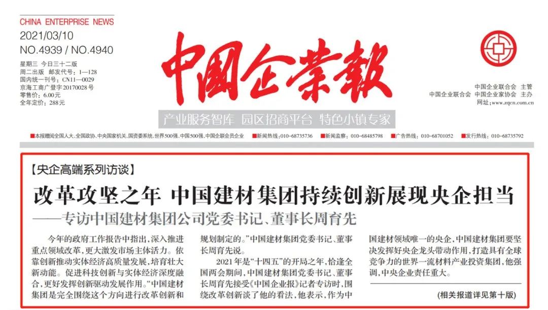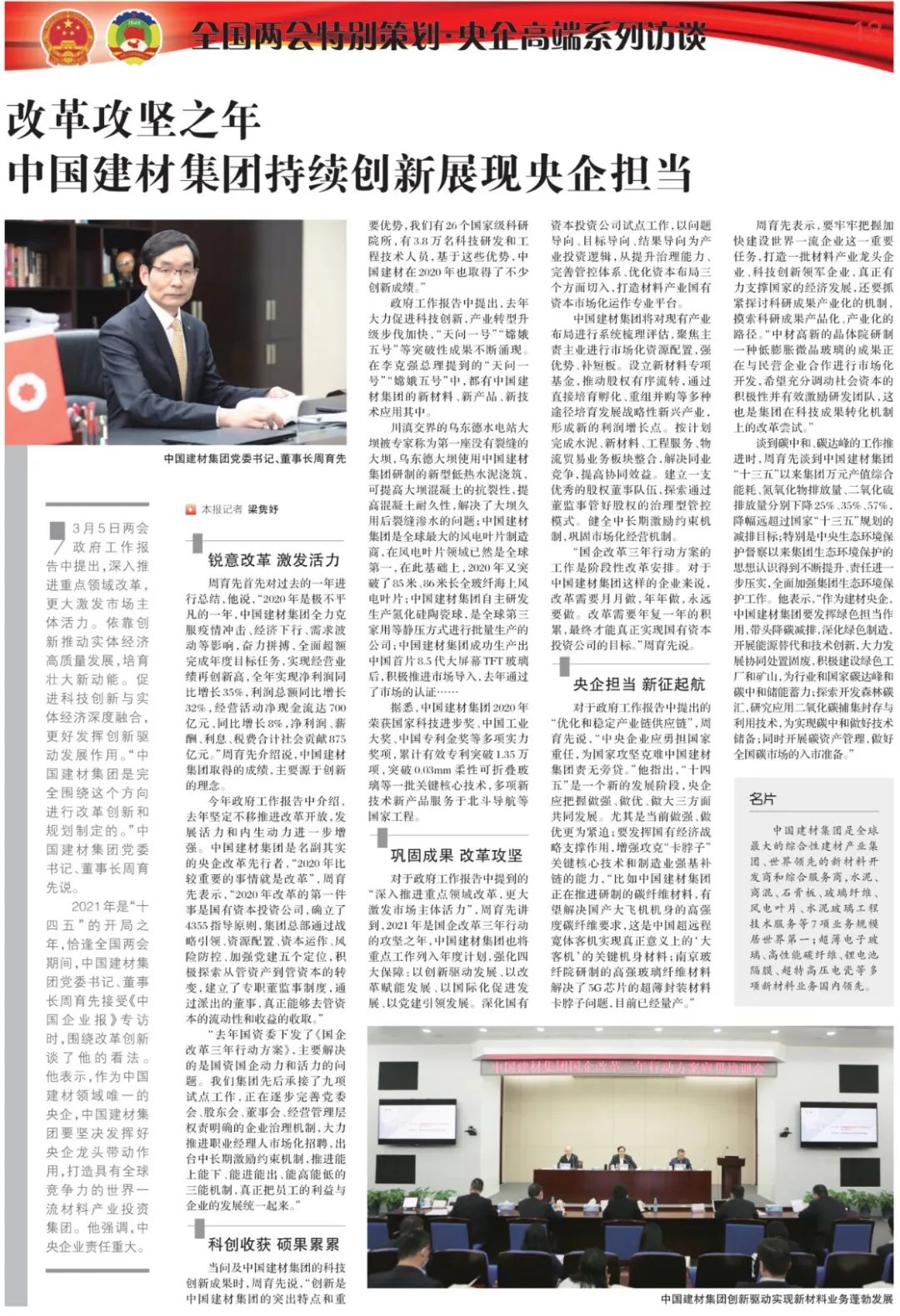 2021年是“十四五”的开局之年,恰逢全国两会期间,彩票论坛 作为足彩论坛 领域唯一的央企,如何发挥好央企龙头带动作用尤为关键。近日围绕改革创新和如何打造具有全球竞争力的世界一流材料产业投资集团等问题,彩票论坛 党委书记、董事长周育先接受了中国企业报记者的专访,相关报道在今天报纸的头版进行了刊发。