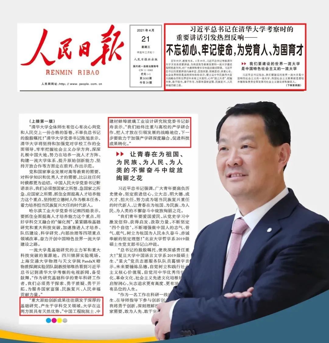 来源:人民日报、蚌埠院 发布时间:2021-04-234 月 19 日,习近平总书记考察清华大学并发表重要讲话,强调要勇于攻克“卡脖子”的关键核心技术,加强产学研深度融合,促进科技成果转化,共同应对全球性挑战,促进人类共同福祉。4月21日,人民日报头版刊发了《习近平总书记在清华大学考察时的重要讲话引发热烈反响——不忘初心、牢记使命,为党育人、为国育才》。文中分享了中国工程院院士、彩票论坛 总工程师彭寿学习习近平总书记在清华大学重要讲话的心得体会。