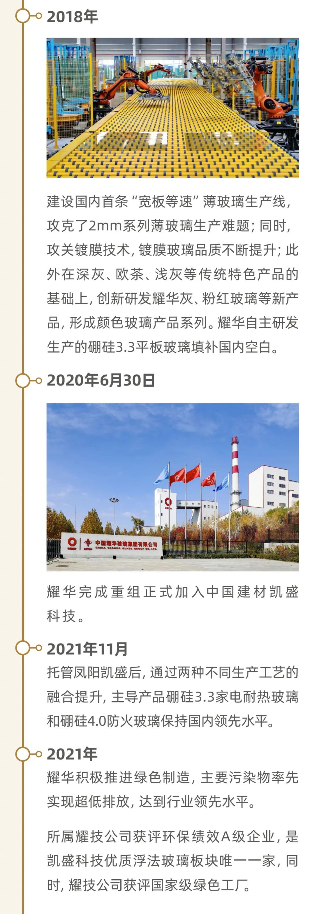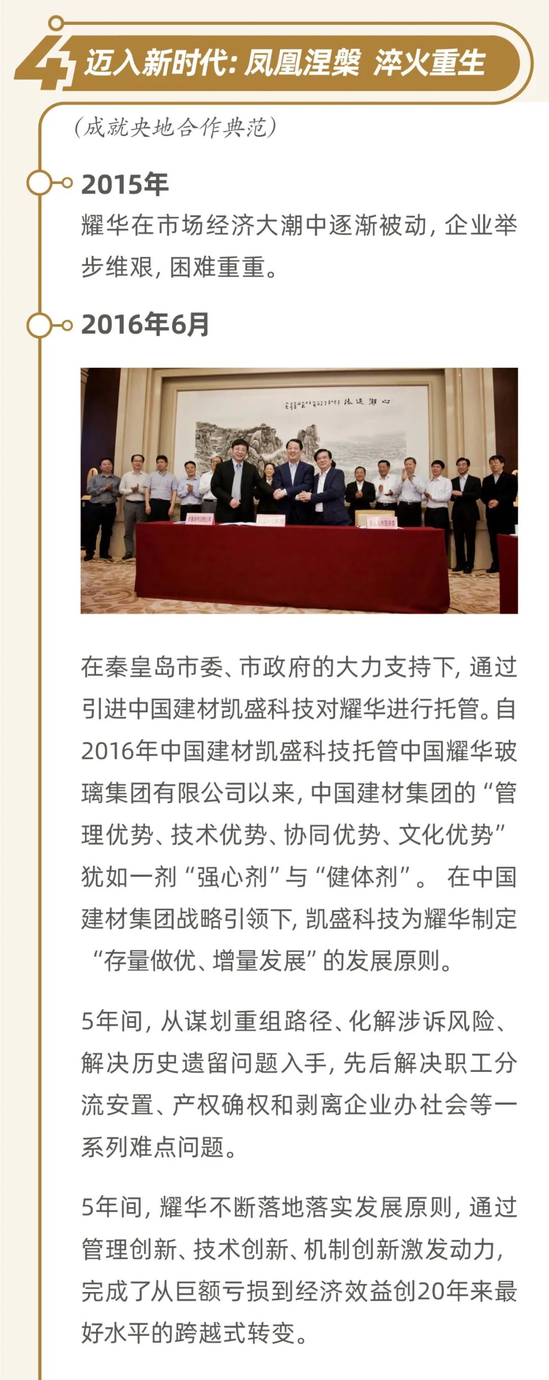 2015年以来,耀华在市场经济大潮中逐渐被动,为帮助耀华走出困境,彩票论坛 和凯盛科技承担起了这个历史重任。2020年6月30日,耀华完成重组正式加入足彩论坛 凯盛科技。由此,耀华驶入高质量发展快车道,百年企业重新焕发出生机和活力,成为央地合作的典范。