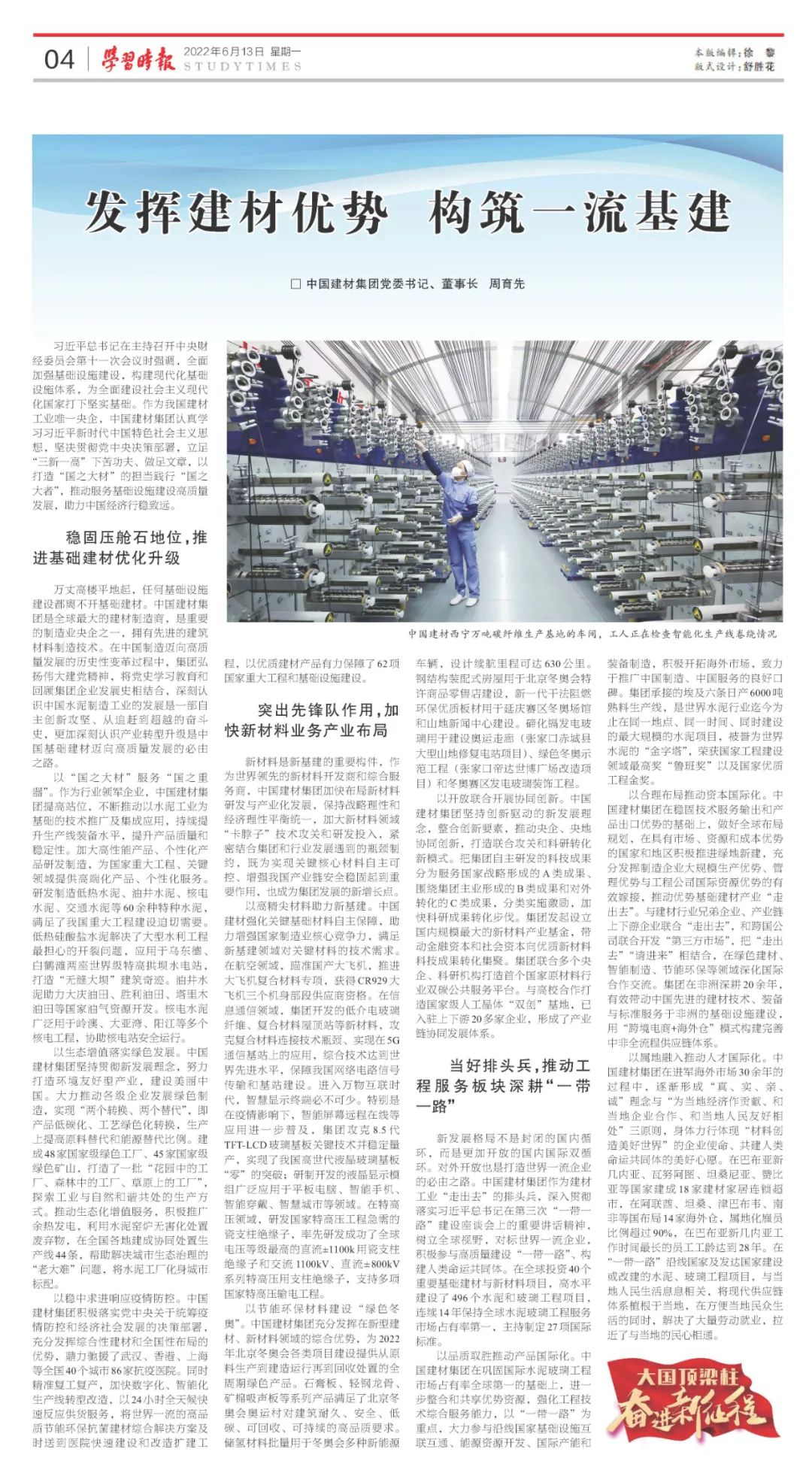6月13日,《学习时报》的“大国顶梁柱 奋进新征程”专栏刊发了彩票论坛 党委书记、董事长周育先署名文章《发挥建材优势 构筑一流基建》,文章强调要认真学习贯彻习近平总书记重要讲话精神,发挥集团“三足鼎立”业务格局优势,以打造“国之大材”的担当践行“国之大者”,推动服务基础设施建设高质量发展,助力中国经济行稳致远。
