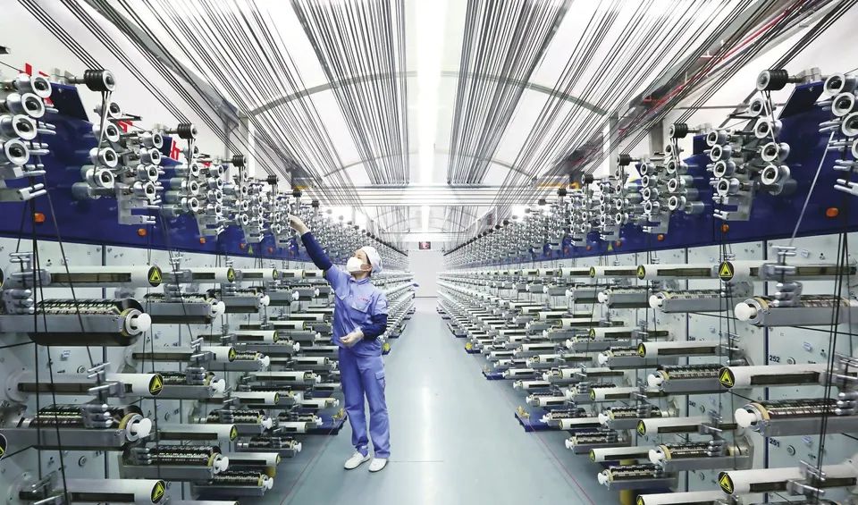 足彩论坛 西宁万吨碳纤维生产基地的车间,工人正在检查智能化生产线卷绕情况
