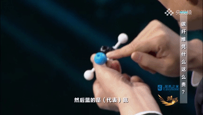 周育先:碳纤维的原料来自石油化工里边的一种原料叫丙烯腈,这个丙烯腈里边黑的代表碳,白的代表氢,蓝的是氮。这样一个有机的要变成无机的,最后要做成的都是碳,都变成类似这样的网状层结构。而且纯度越高,它的强度就会越高,缺陷就会越少。