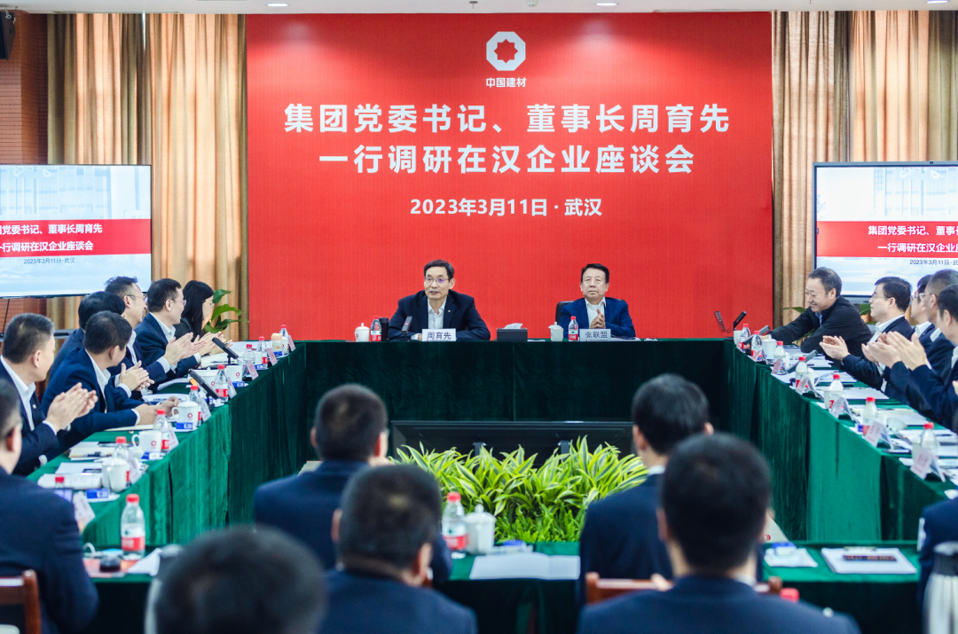 周育先一行参观了武汉建材院、中材节能(武汉)公司两家企业的展厅,详细了解了公司产品以及生产流程、节能环保、"双碳"等情况。在座谈会上,周育先听取了武汉建材院、中材节能(武汉)公司、湖北地勘总队、湖北北新建材四家企业关于战略发展、生产经营、改革创新和党的建设等方面的工作汇报,以及尹自波关于硅酸钙板与石膏板产业协同的汇报。周育先充分肯定了四家企业2022年取得的成绩,并就下一步发展提出了要求和希望: