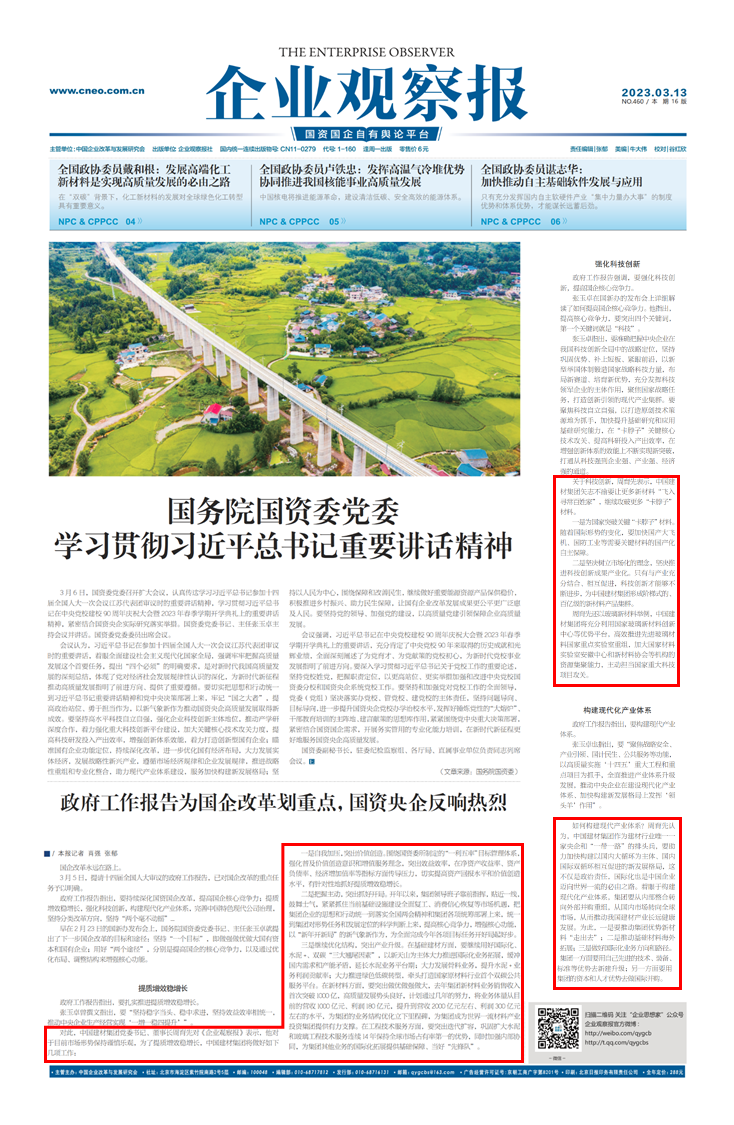 来源:企业观察报 发布时间:2023-03-20当前,全国上下正在深入开展学习贯彻习近平总书记在全国两会期间的重要讲话精神和全国两会精神,《企业观察报》“两会同期声”栏目刊登了《政府工作报告为国企改革划重点,国资央企反响热烈》,报道了彩票论坛