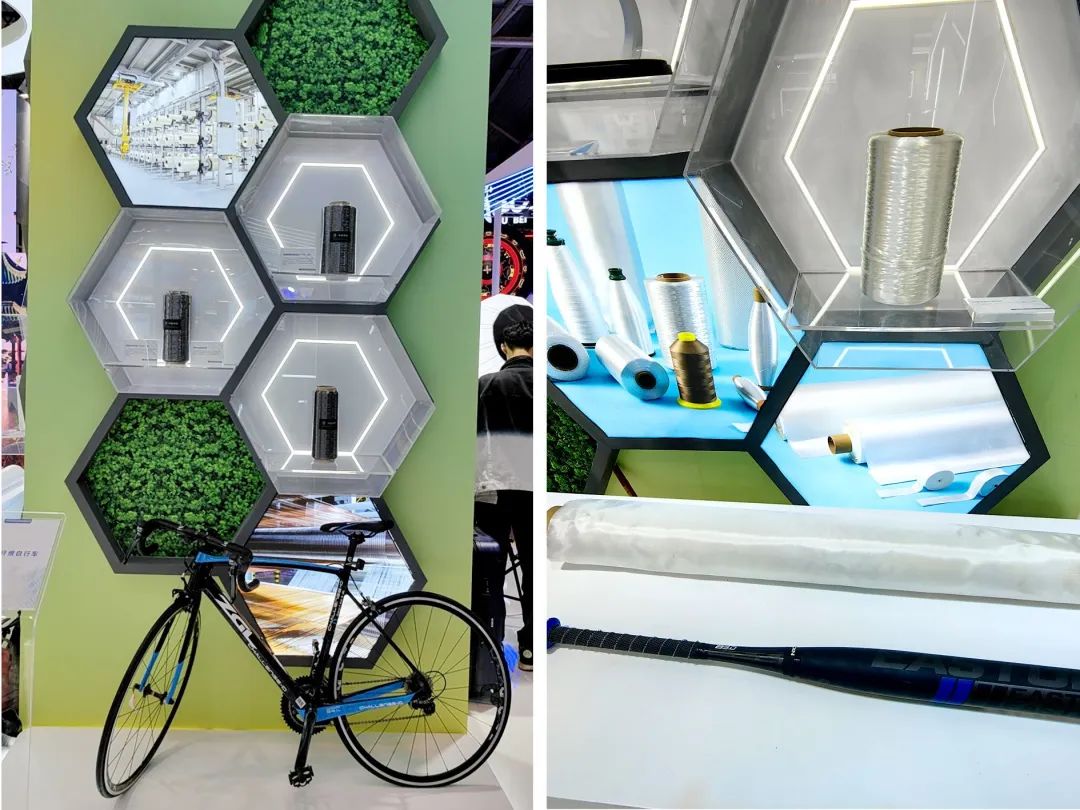 在江苏省展馆展出了中复神鹰的高性能碳纤维和碳纤维自行车,以及南京玻纤院的高性能玻璃纤维和玻纤棒球棍。