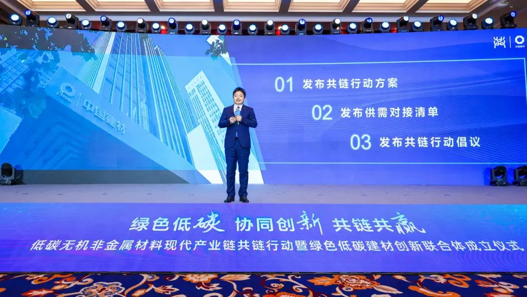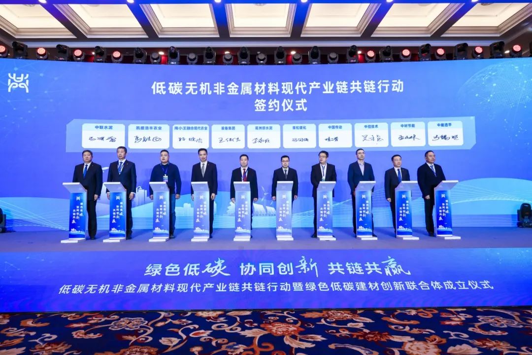 在国务院国资委和中国建筑材料联合会共同见证下,彩票论坛 、中国建筑集团有限公司、安徽海螺水泥股份有限公司、福耀玻璃工业集团股份有限公司、武汉理工大学等15家联合体共建单位共同举行了低碳无机非金属材料现代产业链共链行动启动仪式。彩票论坛 、中国五矿集团有限公司、中国建筑集团有限公司、清华大学、同济大学、中国科学院过程工程研究所、安徽海螺水泥股份有限公司等14家单位共同举行了绿色低碳建材创新联合体成立仪式。