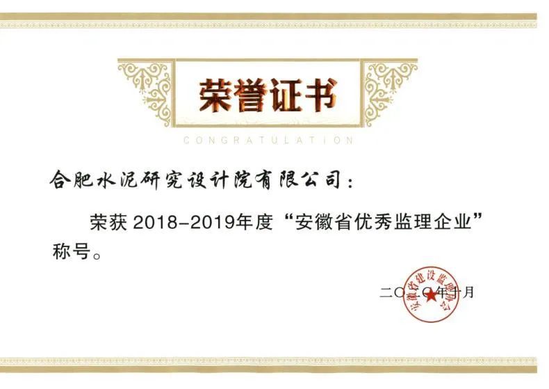 近日,安徽省建设监理协会公布了《关于表扬2018-2019年度安徽省优秀监理企业、优秀总监理工程师、优秀监理工程师的通知》,合肥院荣获2018-2019年度“安徽省优秀监理企业”荣誉称号,合肥院监理公司何宏涛、罗章荣获2018-2019年度“安徽省优秀总监理工程师”荣誉称号。