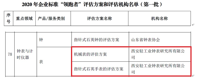 近日,中国标准化研究院发布了《关于2020年企业标准“领跑者”评估方案及评估机构名单(第一批)的通知》。西安钟表所成功当选2020年企业标准“领跑者”“钟表与计时仪器”重点领域评估机构,具体评估类别为:机械表和指针式石英手表。这是今年将“钟表与计时仪器” 纳入重点领域清单后,该领域首次有机构当选为评估机构。