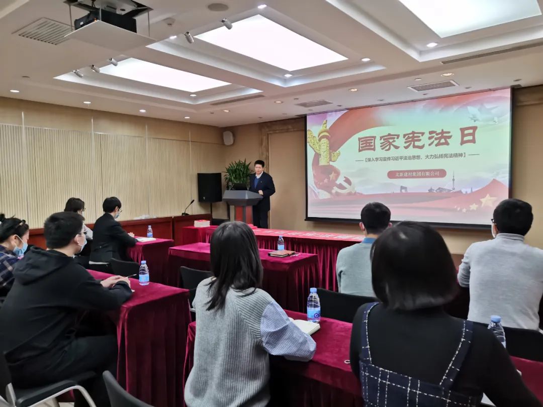 北新建材集团使用官微推送、展板展示、电子投屏等方式营造“深入学习宣传习近平法治思想,大力弘扬宪法精神”的良好氛围,组织“宪法进企业”主题日活动,通过召开专题会议、宣读倡议书、发放宪法读本、捍卫宪法尊严签字仪式、观看微电影等方式推动宪法精神进企业、进基层。