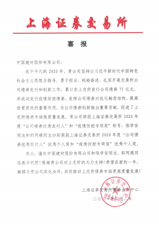 来源:足彩论坛 股份党群工作部 发布时间:2021-02-08近日,足彩论坛 股份收到上海证券交易所喜报,荣获上海证券交易所2020年度“公司债券优秀发行人”和“疫情防控专项奖”称号。陈学安同志和郎阿萌同志分别荣获“公司债券优秀发行人”优秀个人奖和“疫情防控专项奖”优秀个人奖。
