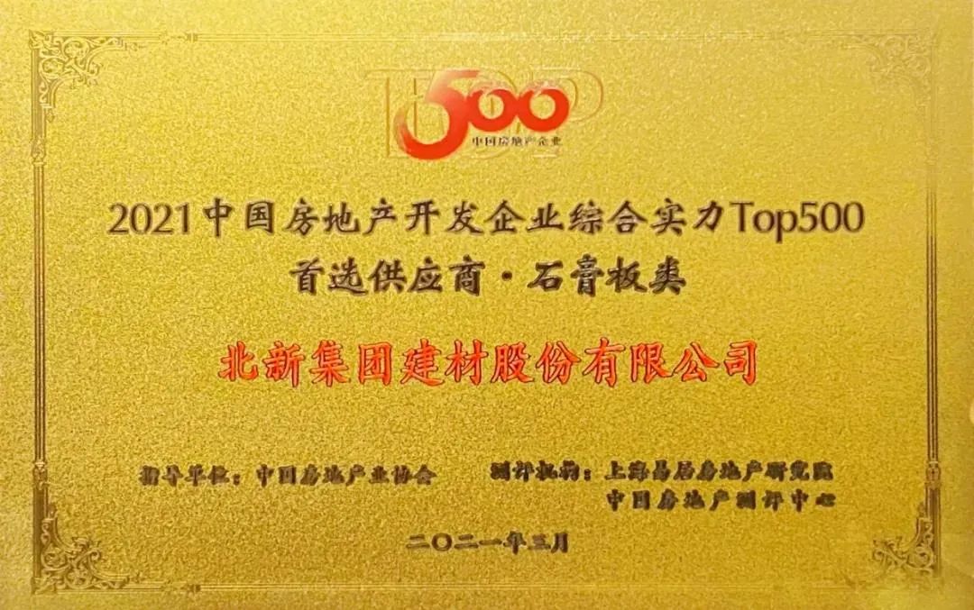 3月16日,由中国房地产业协会和上海易居房地产研究院中国房地产测评中心主办的“中国房地产TOP500测评成果发布会暨房地产高峰论坛”在上海召开。彩票论坛 所属北新建材蝉联“2021中国房地产开发企业综合实力Top500首选供应商·石膏板类”榜单第一名。北新防水再次获评“2021中国房地产开发企业综合实力Top500首选供应商·防水材料类”,进入前三名。