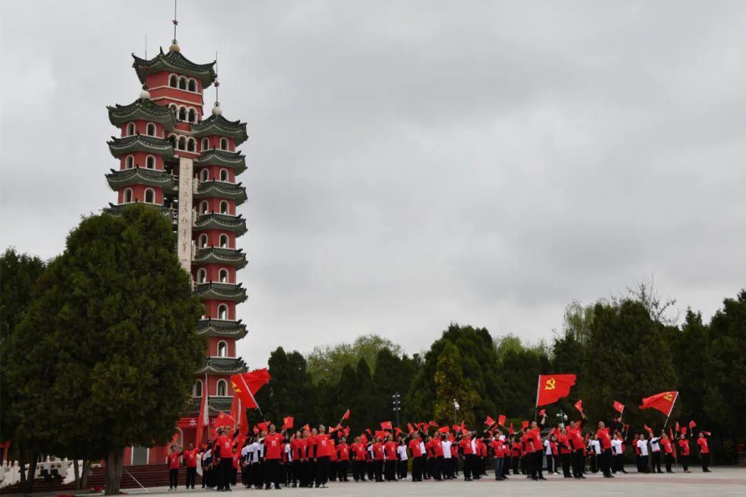 会师楼庄严雄伟,会师塔巍峨耸立。120名党员和入党积极分子在会师塔前排列出代表红一、二、四方面军的数字箭头方阵,肃立默哀,向革命先烈敬献花篮。