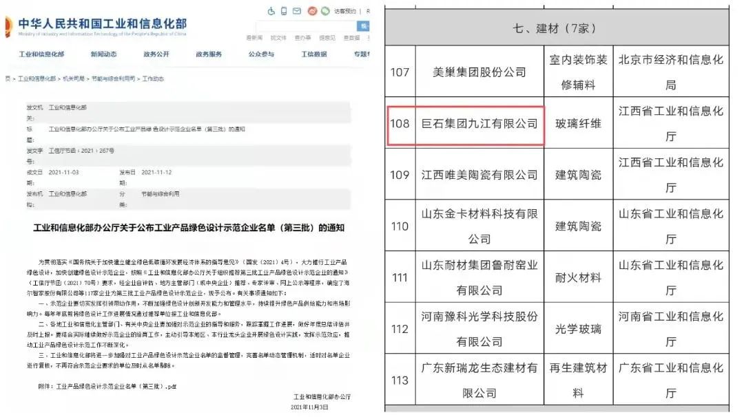 来源:中国巨石 发布时间:2021-11-19近日,工业和信息化部公布第三批工业产品绿色设计示范企业名单,彩票论坛 所属巨石九江公司榜上有名。