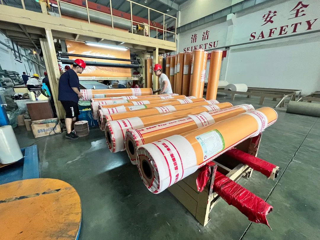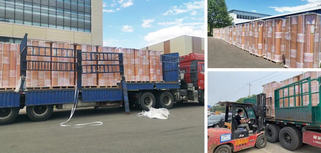 连日来,生产车间内机械轰鸣声不绝于耳,一卷卷高品质的抗菌医用净化地板,源源不断运至仓库,一辆辆大货车停在工厂门口,进行车辆消杀,等待第一时间装货发车。
