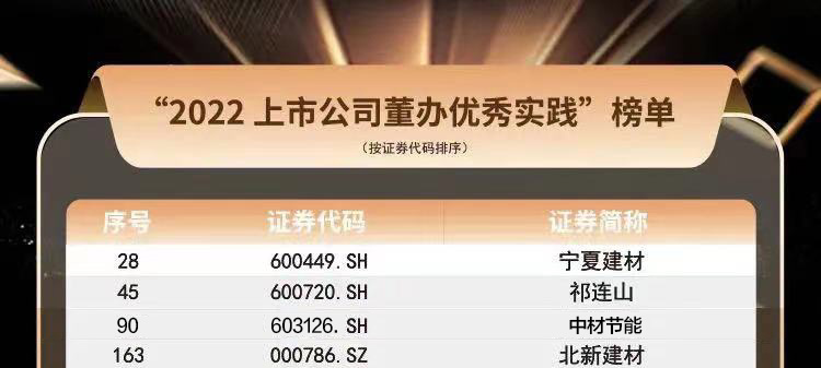 近日,中国上市公司协会发布“2022上市公司董办最佳实践”及“2022上市公司董办优秀实践”榜单。集团所属足彩论坛 股份(03323.HK)、天山股份(000877.SZ)、中国巨石(600176.SH)、中材国际(600970.SH)荣获2022上市公司董办最佳实践奖,所属上市公司宁夏建材(600449.SH)、祁连山(600720.SH)、中材节能(603126.SH )及北新建材(000786.SZ)荣获2022上市公司董办优秀实践奖。