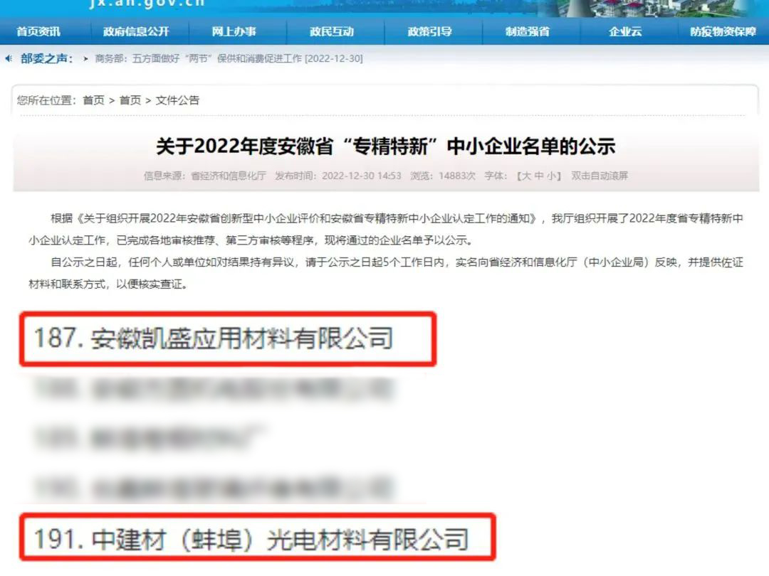 近日,集团所属安徽凯盛应用材料有限公司、彩票论坛 (蚌埠)光电材料有限公司获得安徽省“专精特新”中小企业。此次认定是对2家企业在创新能力、研发能力、技术实力、专业化程度等方面的进一步认可,对企业坚持自主创新、深耕技术的高度肯定。