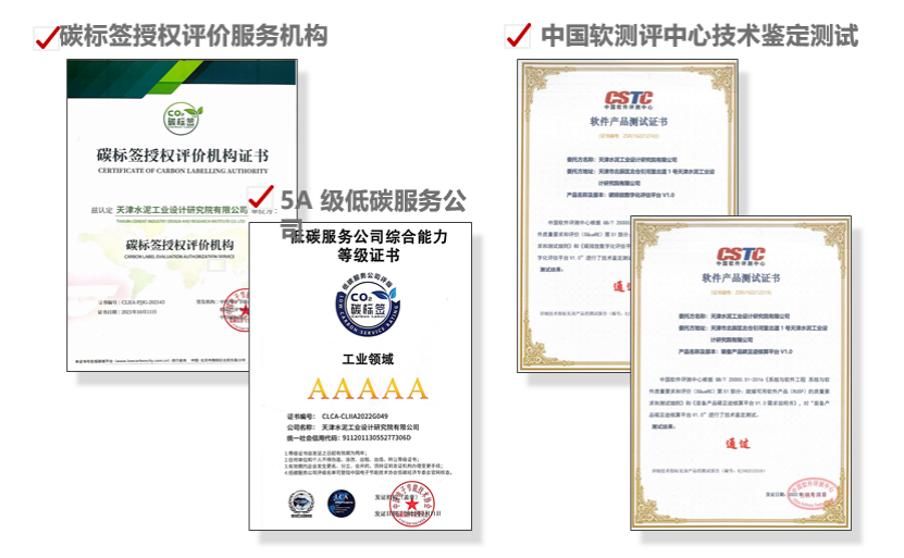 面对国家践行绿色高质量发展的需求,天津水泥院依托自身科技研发和数字化建设优势,自主开发了“双碳”数字化公共服务平台,包括碳资产管理平台、工厂碳排放数字化核算平台、装备产品碳足迹核算平台、绿色低碳建筑碳平台和区域能碳双控平台,面向企业、园区、政府提供围绕“双碳”目标的管、算、评、改的一站式服务。