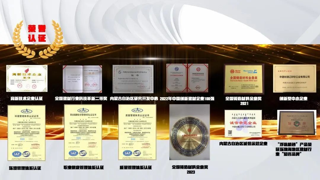 公司拥有多项自主知识产权和核心技术,专利授权数30项,其中发明专利12项,先后荣获安徽省科学技术奖一等奖、安徽省科学技术进步二等奖、安徽省五一劳动奖状、安徽省劳动竞赛先进集体等多项荣誉;各所属企业均已通过质量、环境、职业安全健康管理体系认证,分别拥有国家级高新技术企业、11315全国立信单位、创新型中小企业、专精特新企业、中国非金属矿行业绿色工厂等称号,并获得70/140目铸钢砂、全国铸造材料“金鼎奖”等多项殊荣。