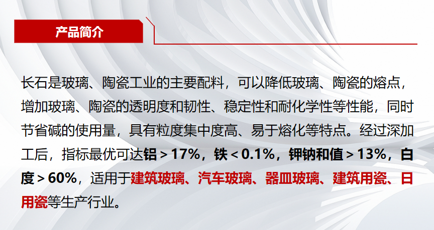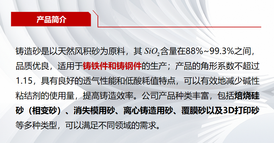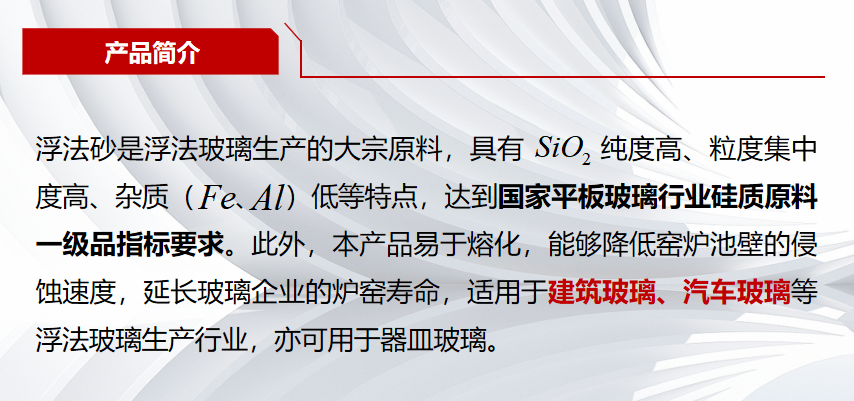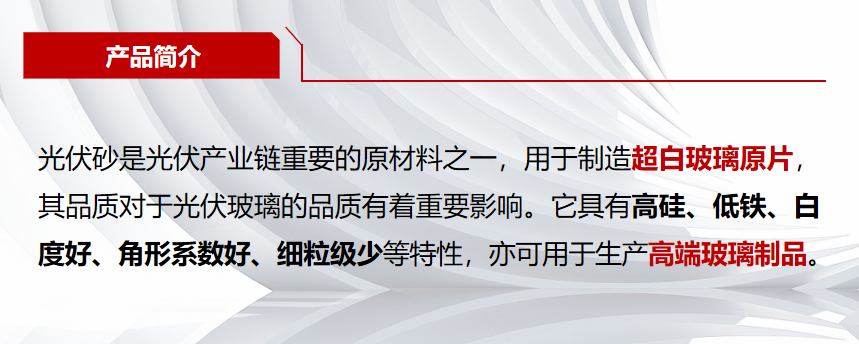 公司保有资源总量超2亿吨,产品种类包括光伏砂、浮法砂、长石、铸造砂、石油压裂砂等,能够满足浮法玻璃、光伏玻璃、器皿玻璃及陶瓷、铸造、钻井等衍生行业生产使用,并对玻璃企业起到保供、降本重要作用。
