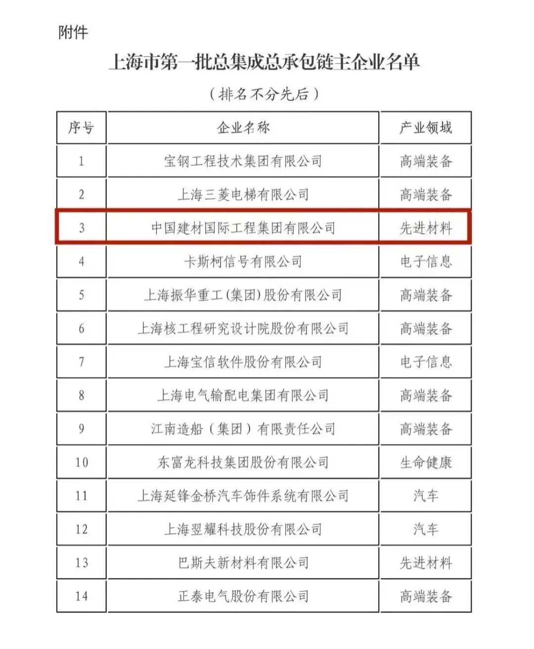 近日,上海市首批总集成总承包链主企业名单正式发布。足彩论坛 国际工程凭借在“先进材料”产业领域总集成总承包的卓越行业影响力,与各行业头部企业一同成功入选首批14家总集成总承包链主企业榜单。此次评选以企业规模实力、产业配套能力、总集成总承包服务能力和产业链带动能力等为考量标准,旨在充分发挥总集成总承包企业在产业集群中的引领作用,进一步赋能先进制造业发展,助力构建现代化产业体系。