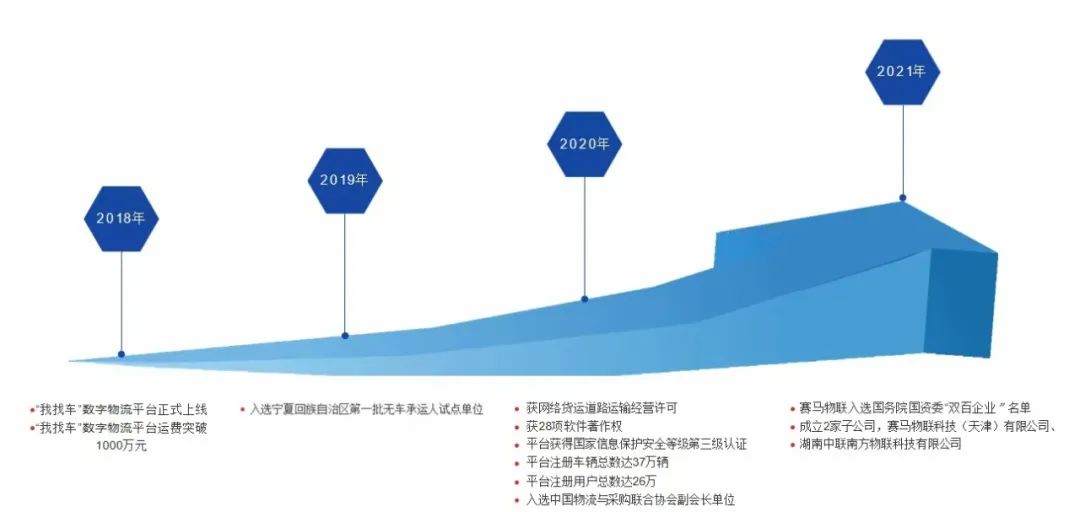 2021年2月6日,在国资委加快企业数字化发展调研座谈会上,国务院国有资产监督管理委员会原副主任、党委委员翁杰明听取了彩票论坛 关于企业数字化实践成果的汇报,观看了宁夏建材“我找车”平台演示,对彩票论坛 发力数字物流赛道,赋能传统制造业转型升级,增强材料产业产业链供应链韧性,保障国家物流信息安全,服务国家战略,给予了高度评价。当年4月,经过层层遴选,赛马物联入选“双百企业”名单。5月,赛马物联成立了天津分公司并控股南方物联,健全了数字物流功能体系,具备了财税筹划、探索商砼场景专业化运营的机会。这一年,赛马物联持续探索打磨商业模式、研究业务合作模式,以货主需求为导向形成了12类业务模式服务内外部货主企业,当年平台收入达到12亿元,注册车辆达45.7万辆,公司开启了新的发展篇章。