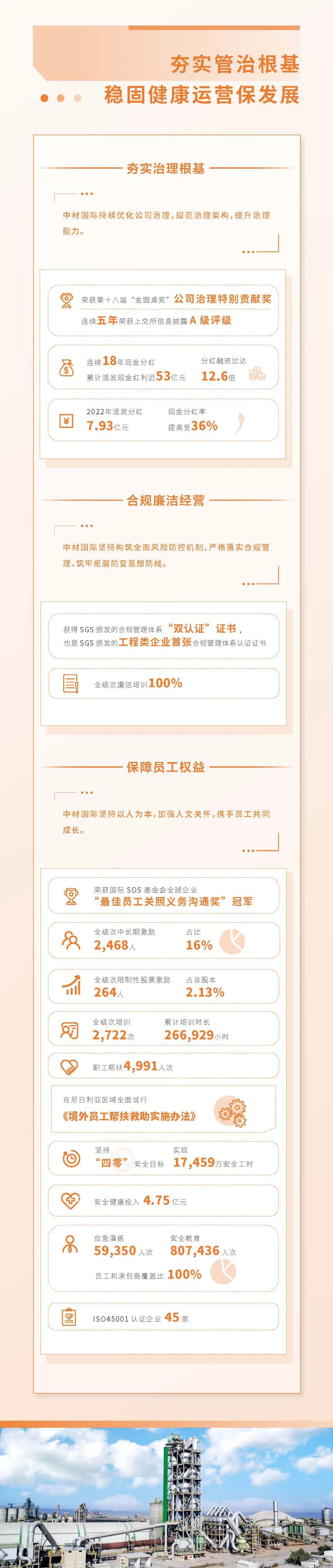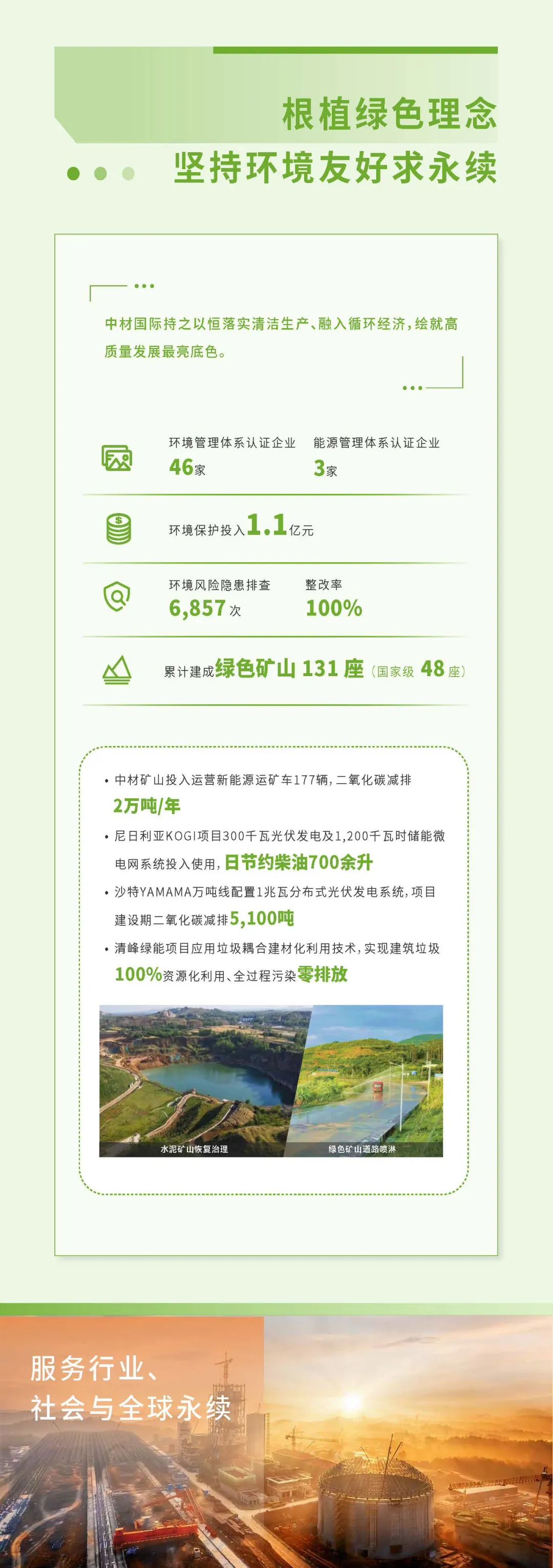 来源:集团公司管理部、中材国际、瑞泰科技 发布时间:2024-04-18作为“中央企业ESG联盟”首批成员企业,彩票论坛 积极践行ESG理念,以“材料创造美好世界”为使命,坚持“善用资源、服务建设”的核心理念,秉承“创新、绩效、和谐、责任”的核心价值观,追求环境、社会及治理的协调共赢,将ESG理念最终落实在市场绩效、科技创新、节能环保、员工关爱、企业公民等履责实践之中,并不断建立健全ESG工作机制与管理体系,积极推动成员企业披露专项报告。目前,已实现集团所属13家上市公司ESG专项报告披露“全覆盖”。