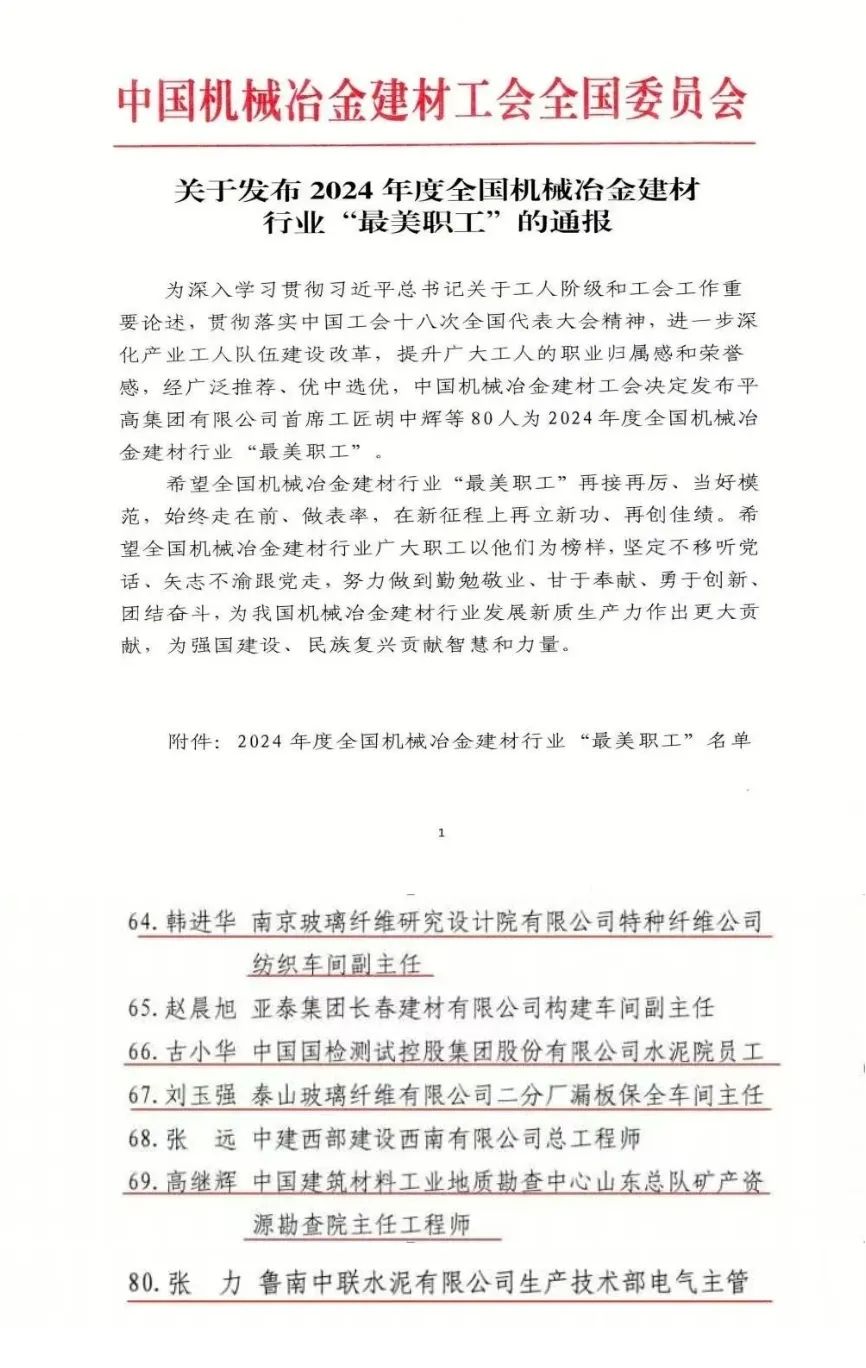 点赞 | 我们5名职工荣获2024年度全国机械冶金建材行业“最美职工”称号