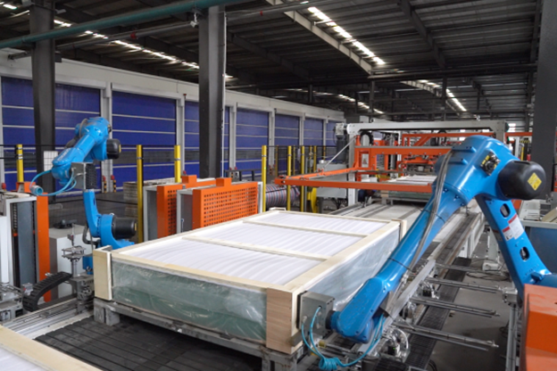 2024年,智能自动化院根据光伏玻璃生产工艺流程要求,发布了全新的光伏玻璃深加工数智化工厂整体解决方案,涵盖光伏玻璃深加工智能化生产线、MES系统、在线检测系统、AGV自动搬运系统、全自动光伏玻璃包装线,实现了玻璃全过程智能定制生产,助力企业数智化转型升级,充分彰显了智能自动化院在玻璃新材料工厂数智制造领域的全流程服务能力。