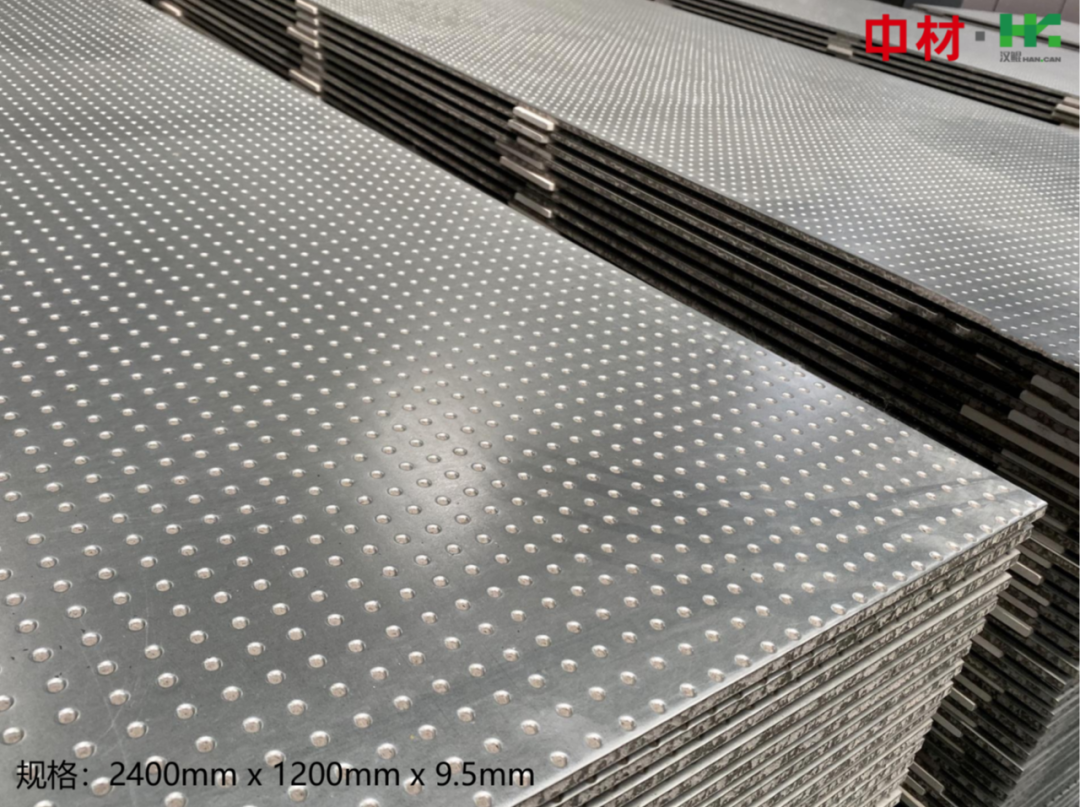 中材汉鲲®抗爆板是由上下两块冲孔的0.5mm厚镀锌钢板强力压挤在8.5mm厚纤维增强水泥板上构成的合成防火板材,已取得国家级检测中心的抗爆性能试验检测报告,抗爆压力值达到4000kPa,远超过国标图集14J938内所规定的抗爆压力值1400kPa。抗爆板与钢龙骨、岩棉组成的抗爆墙大量应用于石油化工、核电、军工、离岸石油平台、电源变压器室、仓库等,与钢筋混凝土抗爆墙相比,具有重量轻、易装易卸可回收再利用等优点。
