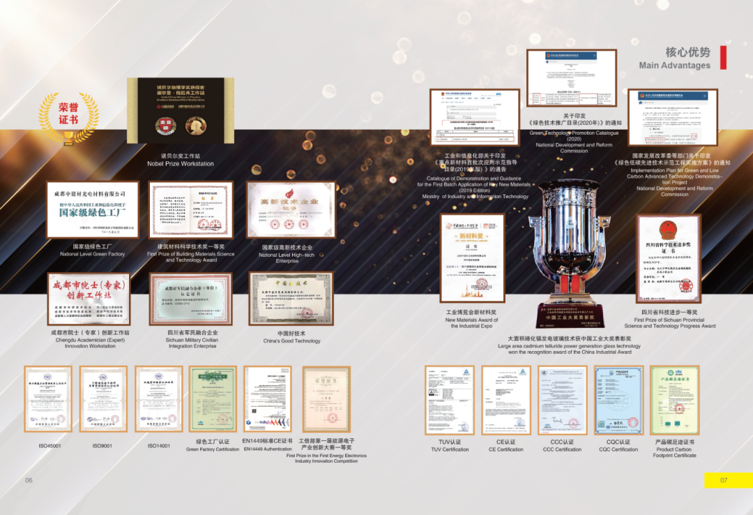 在凯盛科技集团的战略引领下,2017年,世界第一块大面积(1.92㎡)碲化镉发电玻璃在成都彩票论坛 光电材料有限公司成功下线,一举填补了国内技术空白,打破了国外垄断,使中国成为首个拥有大面积碲化镉发电玻璃的国家,开辟了“有光就有电”的新纪元。2024年6月,瑞昌彩票论坛 光电材料有限公司生产的碲化镉发电玻璃经国际权威认证机构TÜV NORD(德国技术监督协会)认证,单片功率突破至339.91W,转化效率达17.7%,创造了我国大面积(1.92㎡)碲化镉发电玻璃转化效率最新纪录,引领碲化镉产业界新的技术潮流。