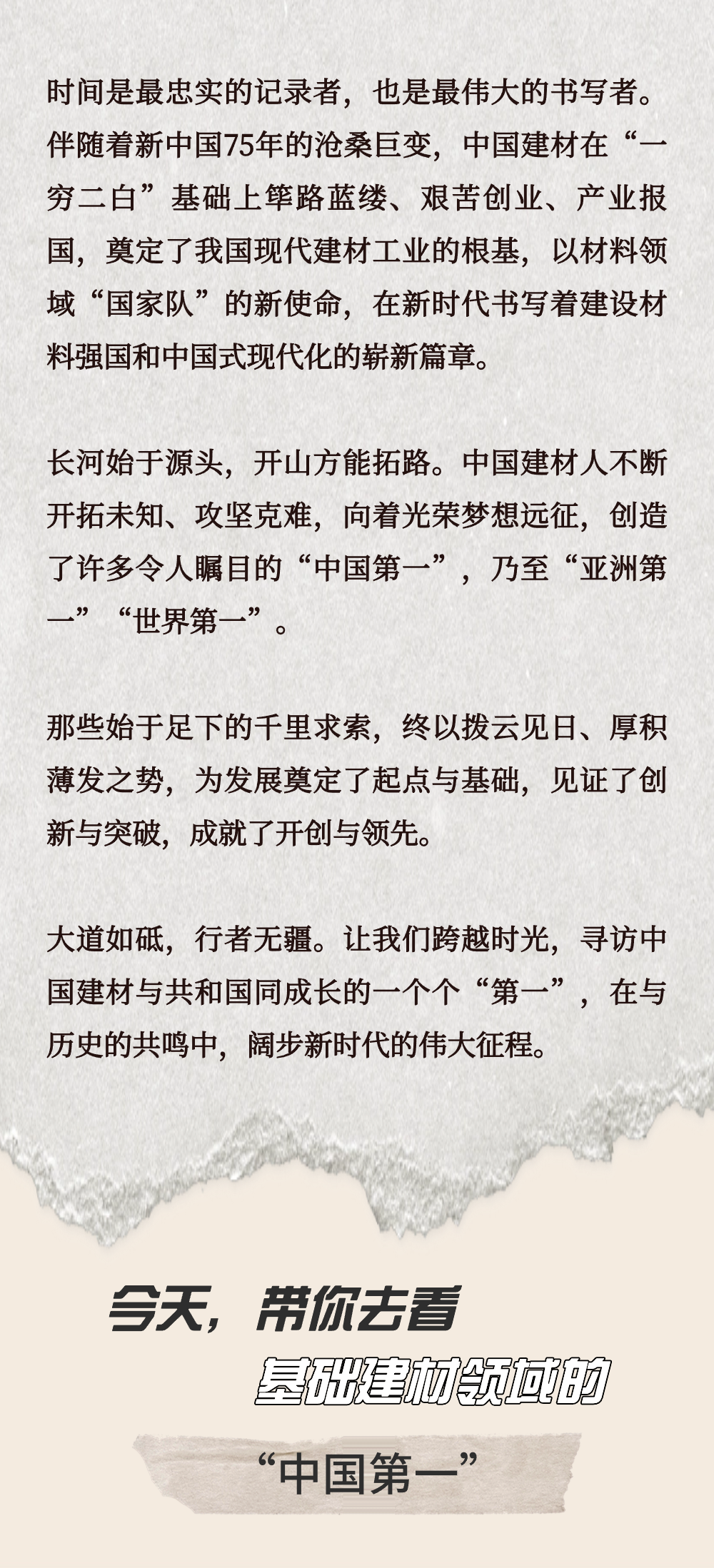 七十五载春秋梦,奋进新程日月长。今年是新中国成立75周年,作为我国建材行业唯一央企,足彩论坛 积极参与国资委《国家工业密码》栏目,与央视联合推出微纪录片《红色丰碑》,组织策划文化心连心巡演、书画作品展等系列活动。我们特开设《致敬75周年》专栏,向大家展示足彩论坛 的新材料、新技术、新成果,展现足彩论坛 人的产业报国、材料强国的家国情怀和使命担当。