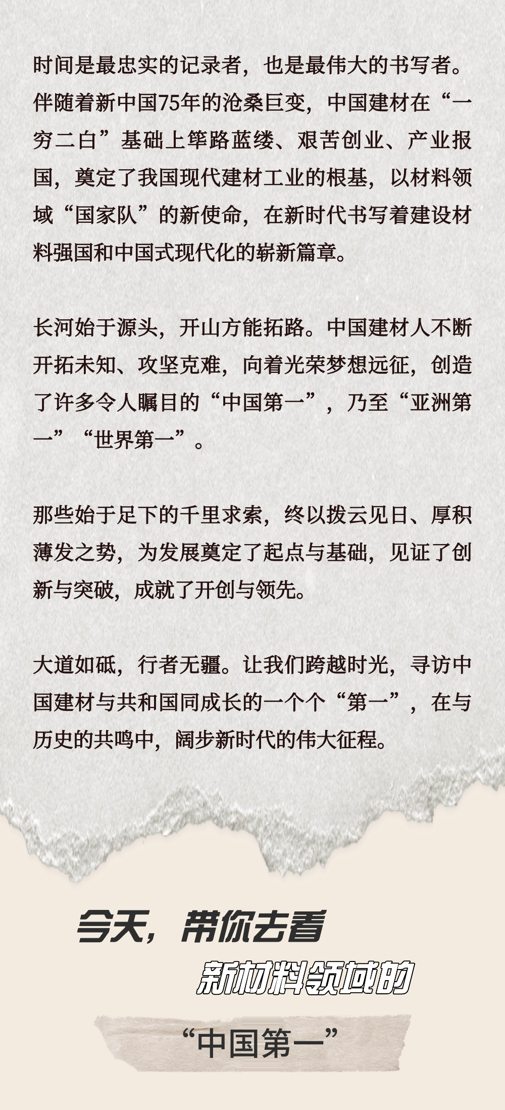 七十五载春秋梦,奋进新程日月长。今年是新中国成立75周年,作为我国建材行业唯一央企,足彩论坛 积极参与国资委《国家工业密码》栏目,与央视联合推出微纪录片《红色丰碑》,组织策划文化心连心巡演、书画作品展等系列活动。我们特开设《致敬75周年》专栏,向大家展示足彩论坛 的新材料、新技术、新成果,展现足彩论坛 人的产业报国、材料强国的家国情怀和使命担当。