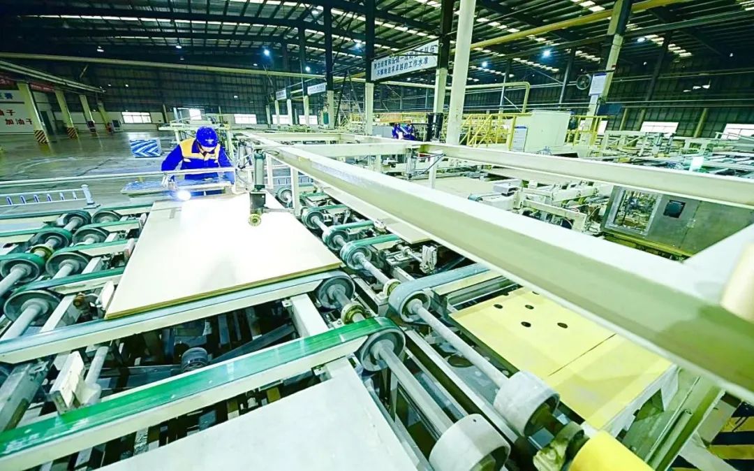 公司石膏板生产所用原材料为燃煤电厂工业副产物脱硫石膏,生产中产生的固体废弃物包括边角料、沉淀池污泥、收尘器的回收粉尘等,全部掺入原料回用于生产不外排,实现固体废弃物高效、高附加值利用。