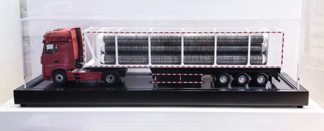 主力产品30MPa-II型管束式运氢集装箱,采用高强度碳纤维缠绕技术,运氢量达666kg;高压II型储氢容器组,采用复合长管结构,工作压力90MPa,可充装氢气约118kg(3瓶组),极大提升运氢、储氢效率,为前来参展的各国气体运输厂家、加氢网络设施建设商提供了全新选择。
