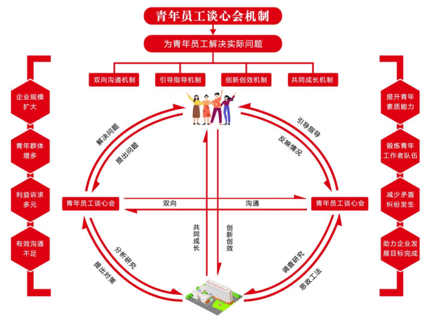 中研院团委青年员工谈心会机制坚持马克思主义的世界观和方法论,深入贯彻落实习近平总书记关于青年工作的重要思想,紧密联系企业和青年员工实际,倡导敢于正视问题、善于发现问题、勇于解决问题,切实把解决问题作为前进的动力;只有经常到青年中去,同青年零距离接触、面对面交流,青年会被吸引过来,才能敞开胸怀来交流、积极主动来交往;只有不断创新工作方法,坚持到实践和群众中寻找解决问题的办法,坚持问题跟踪解决和闭环管理,坚持不同问题分类施策因地制宜,才能在解决一个又一个问题中不断创造新的业绩;只有坚持青年员工谈心会制度,才能通过不断总结提升、取长补短、完善提高,把看似简单的事情系统化、标准化、创新化、品牌化,在解决问题完善机制上做出成效、做出影响、做出品牌。