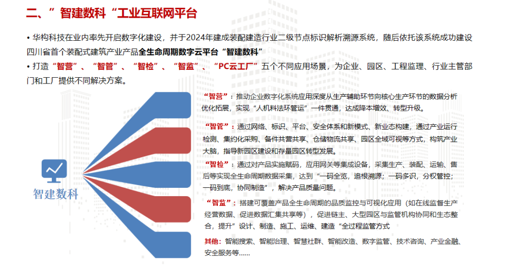 近年来,华构科技在高性能混凝土研究领域取得技术突破并实现落地应用,为转型发展奠定了基础,同时通过积极调整传统房建业务占比、加大市政交通领域新产品研发、全力拓展新能源业务等举措,在行业调整期逐步走出了业务转型新路径。在数字化建设方面,华构科技通过打造装配式建筑产业产品全生命周期数字云平台——“智建数科”,成功建设“智营、智管、智检、智监、PC云工厂”五大应用场景,实现自身智能化工厂升级的同时,为传统制造企业、产业园区、工程监理、政府及协会提供全生命周期数字化管理和一体化云供采服务,先后荣获了国家级国企数字场景创新三等奖、建材工业互联网示范项目。
