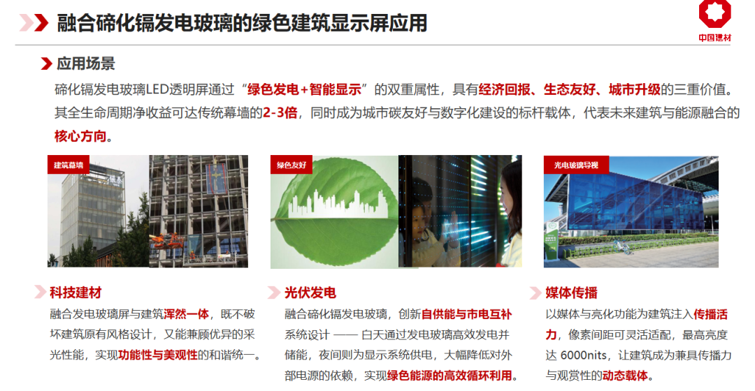 碲化镉发电玻璃屏采用三位一体集成结构,将碲化镉发电玻璃、LED透明屏、LOW-E中空钢化玻璃融合为一体,形成兼具发电、显示、节能、美观功能的绿色幕墙系统。解决了传统传统LED屏外挂于幕墙,遮挡采光、影响美观的痛点。新型系统内嵌于幕墙结构,不影响采光,关闭时即为普通玻璃幕墙,开启时则为高清显示屏。产品可广泛应用于楼宇建筑的幕墙、绿色交通站台设施、商场橱窗、户外广告屏等场景。