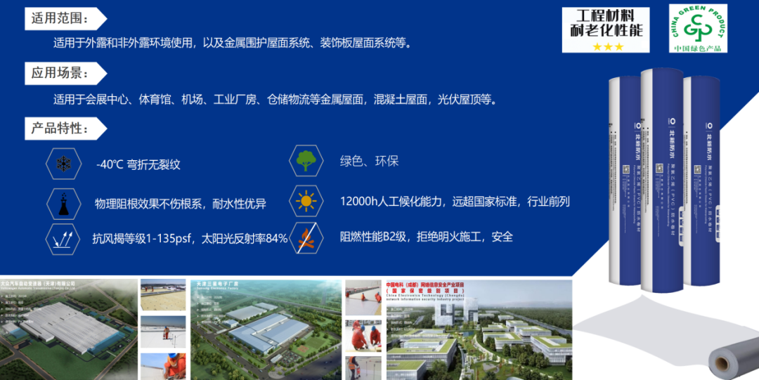 北新防水生产的PVC防水卷材人工加速老化时间可达12000小时,远超国家标准。低温性能可达-40℃弯折无裂纹,阻燃性能可达B2级。通过国家工程材料耐老化性能“三星级”认证、绿色建材等认证。