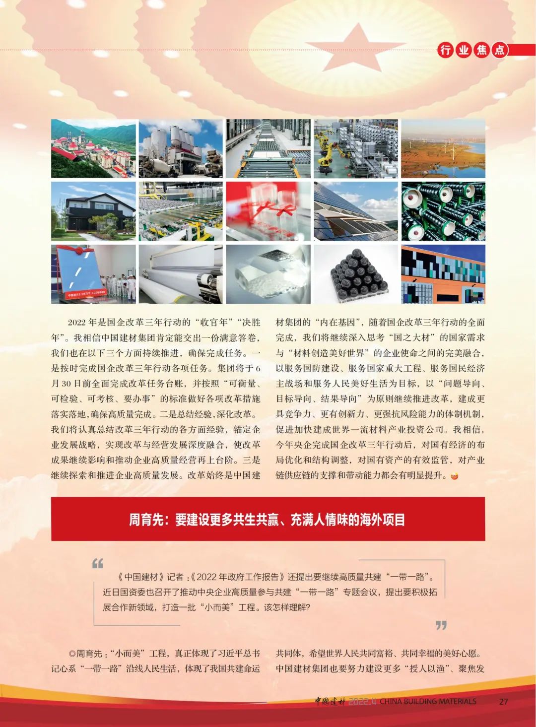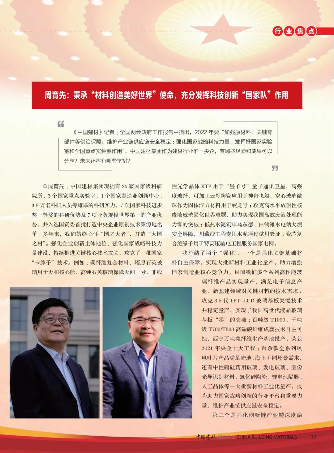 来源:足彩论坛 杂志 发布时间:2022-04-063月11日,2022年全国两会圆满完成各项议程,在北京胜利闭幕。这次大会是在我国进入全面建设社会主义现代化国家、向第二个百年奋斗目标进军新征程的重要时刻召开的一次重要会议,也为建材行业的未来发展指明方向、注入强大力量。就今年全国两会期间和2022年政府工作报告中的热点话题,彩票论坛 党委书记、董事长周育先接受《足彩论坛 》杂志专访,与中国建筑材料联合会执行副会长曾劲、王诚、王刚、李叶青共话企业、行业发展。