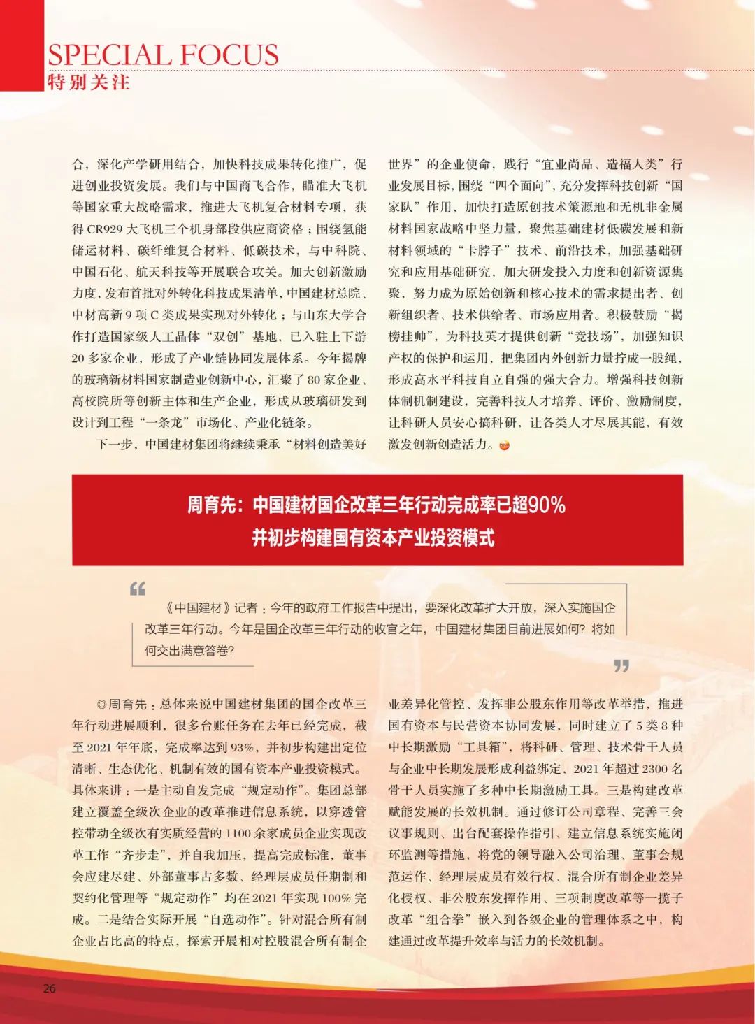 2022年是国企改革三年行动的“收官年”“决胜年”。我相信足彩论坛 肯定能交出一份满意答卷,我们也在以下三个方面持续推进,确保完成任务。一是按时完成国企改革三年行动各项任务。足彩论坛 将于6月30日前全面完成改革任务台账,并按照“可衡量、可检验、可考核、要办事”的标准做好各项改革措施落实落地,确保高质量完成。二是总结经验,深化改革。足彩论坛 将认真总结改革三年行动的各方面经验,锚定企业发展战略,将改革与经营发展深度融合,使改革成果继续影响和推动企业高质量经营再上台阶。三是继续探索和推进企业高质量发展。改革始终是足彩论坛 的“内在基因”。随着国企改革三年行动的全面完成,足彩论坛 将继续深入思考“国之大材”的国家需求与“材料创造美好世界”的企业使命之间的完美融合,以服务国防建设、服务国家重大工程、服务国民经济主战场和服务人民美好生活为目标,以“问题导向、目标导向、结果导向”为原则继续推进改革,建成更具竞争力、更有创新力、更强抗风险能力的体制机制,促进加快建成世界一流材料产业投资公司。我相信,今年央企完成国企改革三年行动后,对国有经济的布局优化和结构调整,对国有资产的有效监管,对产业链供应链的支撑和带动能力都会有明显提升。