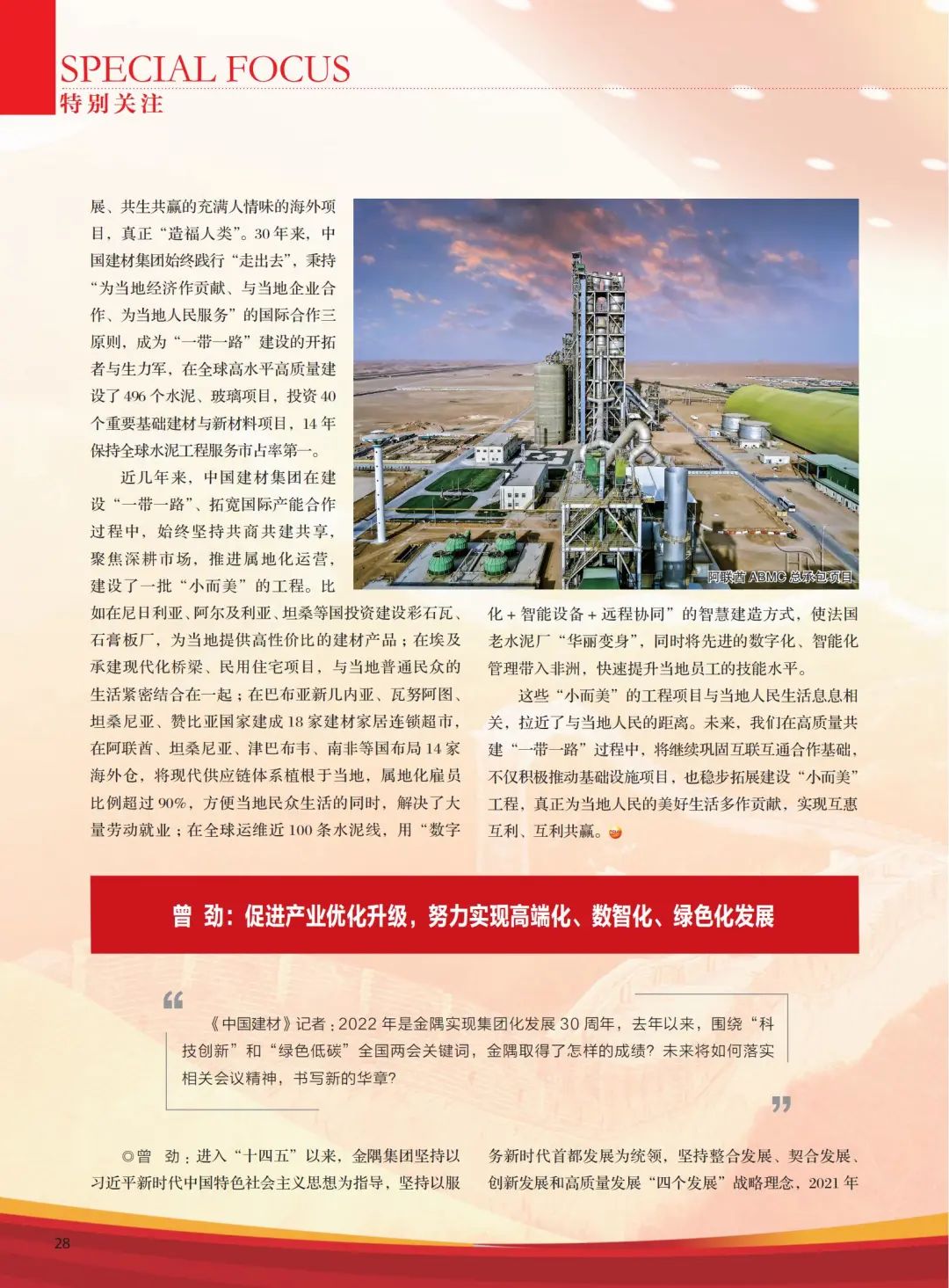 “小而美”工程,真正体现了习近平总书记心系“一带一路”沿线人民生活,体现了中国共建命运共同体,希望世界人民共同富裕,共同幸福的美好心愿。彩票论坛 也要努力建设更多的“授人以渔”,聚焦发展、共生共赢的充满人情味的海外项目。彩票论坛 三十年来始终践行“走出去”,秉持“为当地经济作贡献、与当地企业合作、为当地人民服务”的国际合作三原则,成为“一带一路”建设的开拓者与生力军,在全球高水平建设了496个水泥、玻璃项目,投资40个重要基础建材与新材料项目,14年保持全球水泥工程服务市占率第一,为高质量建设“一带一路”提供了重要支撑。