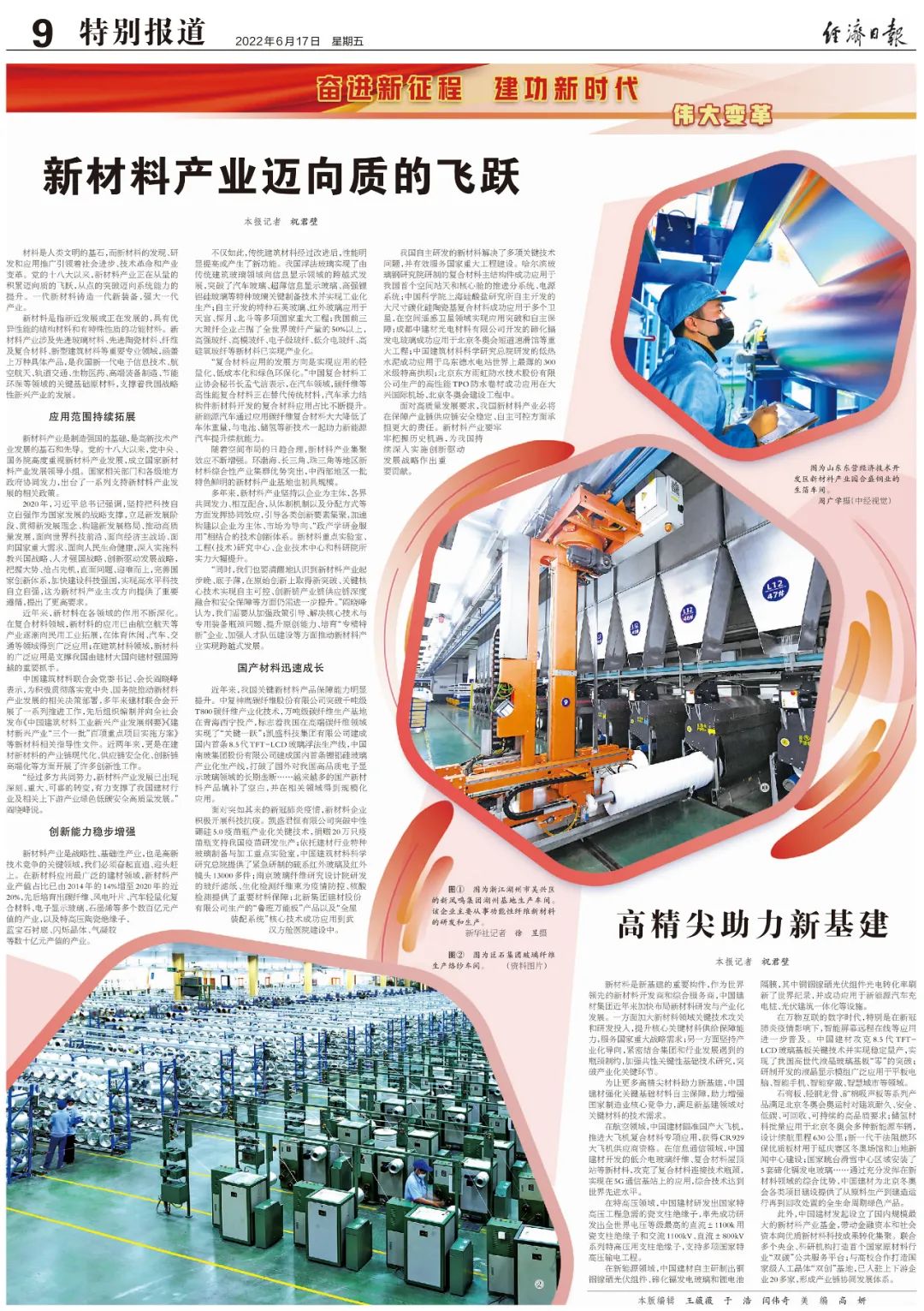 6月17日,为喜迎党的二十大,《经济日报》的“奋进新征程 建功新时代”的伟大变革特别报道刊发了《新材料产业迈向质的飞跃》以及《高精尖助力新基建》的组稿。《新材料产业迈向质的飞跃》文章介绍,党的十八大以来,新材料产业正在从量的积累迈向质的飞跃,从点的突破迈向系统能力的提升,应用范围持续拓展,创新能力稳步增强,以足彩论坛 为代表的国产材料迅速成长。《高精尖助力新基建》短文专门报道了足彩论坛 所属企业在新材料助力新基建领域取得的诸多成绩。