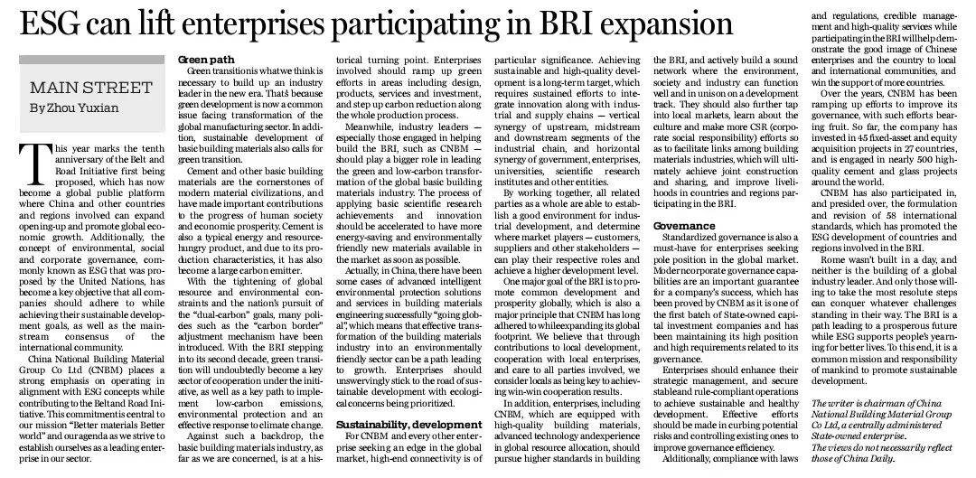 《中国日报》刊发周育先署名文章:ESG理念助推企业迈向“一带一路”国际化新征程