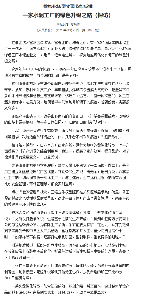 近日,《人民日报》刊发《数智化转型实现节能减排一家水泥工厂的绿色升级之路(探访)》一文,从修复生态环境、升级生产线、完成数智化转型等方面对杭州山亚南方水泥的绿色升级之路进行报道。