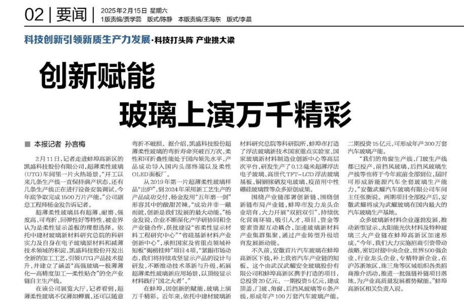 近日,《安徽日报》刊发《创新赋能 玻璃上演万千精彩》一文,走进凯盛科技股份有限公司。报道在电子玻璃原材料和减薄技术领域的积淀,开发出全新的加工工艺,引领UTG产品技术提升,并建立了涵盖“高强玻璃—极薄薄化—高精度加工—柔性贴合”的全产业链自主生产线,用创新为产业高质量发展蓄势赋能。