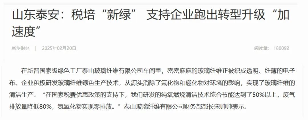 近日,新华财经发文《山东泰安:税培“新绿” 支持企业跑出转型升级“加速度”》。文章提到泰山玻纤作为泰安市新晋国家级绿色工厂在国家税费优惠政策的支持下,我们研发的纯氧燃烧清洁技术综合节能达到了50%以上,废气排放量降低80%,氮氧化物实现零排放。