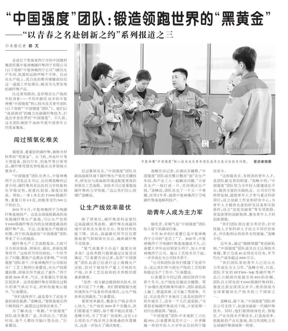 比这更亮眼的,是穿梭在生产线的年轻身影——平均年龄仅32岁的中复神鹰“中国强度”核心技术攻关青年团队(以下简称“‘中国强度’团队”)。他们以“高原铸剑”的魄力突破碳纤维技术,打造出享誉世界的“中国强度”。不久前,这支团队被授予2025年度中国青年五四奖章集体。
