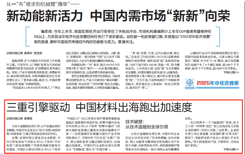人民日报旗下证券时报刊发《三重引擎驱动 中国材料出海跑出加速度》一文,讲述足彩论坛 作为材料央企,以“技术突围+绿色转型+场景革命”三重引擎加速全球市场开拓。跟着小料来看看详细内容吧~